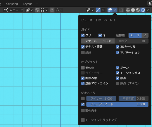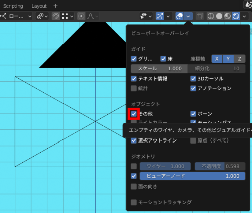 カメラの表示が邪魔の時には、「ビューポートオーバーレイ」の「その他」のチェックを外せば非表示にすることができます。