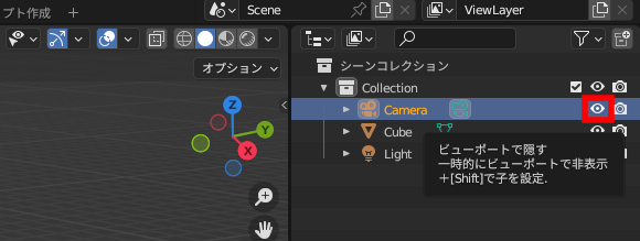 「アウトライナー」の目のマークをクリックしても非表示になりますが、カメラに設定した背景なども消えてしまうので、使用用途によっての使い分けですね。