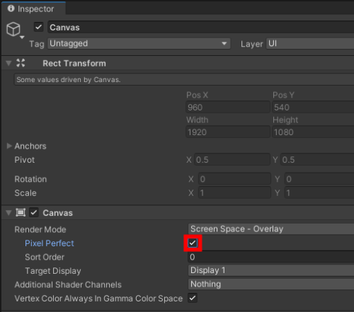 「Canvas」の「Pixel Perfect」を有効にすると、Image要素などをぼけを防ぎ、鮮明に表示させることができます。